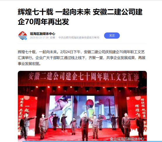 輝煌七十載,一起向未來。2月24日下午,安徽二建公司慶祝建企70周年職工文藝匯演舉行。企業廣大干部職工通過線上線下,齊聚一堂,共享企業發展成果,再展事業發展宏圖。