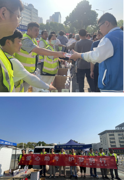 “中考加油”“旗開得勝!”青年志愿者正在為夏日炎炎下等待入場的中考考生送上助考物資和祝福。紫郡府項目部在淮北市中考考點設“愛心送考”服務臺,為中考學子提供礦泉水、應急文具用品等,提醒考生們檢查準考證、身份證等考試必備用品。