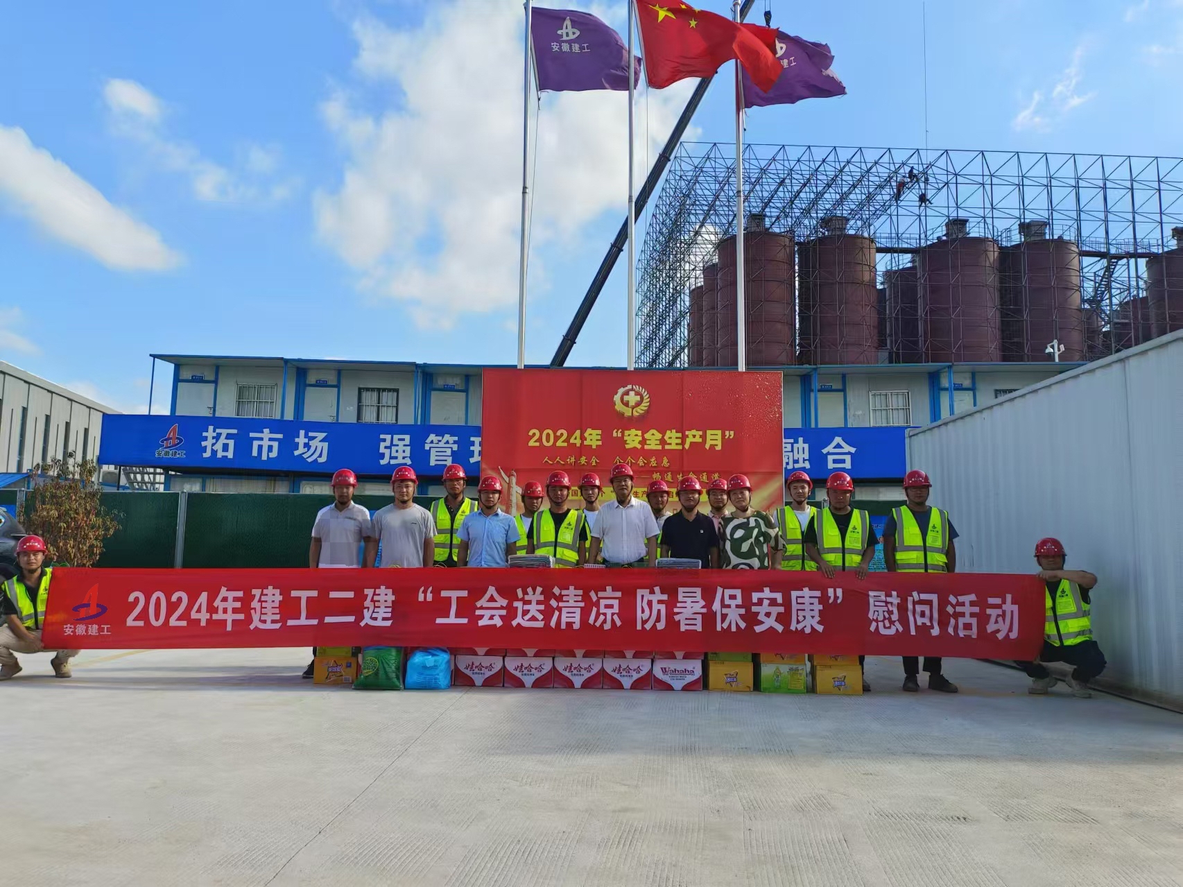 驕陽似火,酷暑難耐,為做好職工防暑降溫工作,有效防控高溫中暑事件和安全生產事故的發生,切實維護廣大職工的勞動安全和健康,7月25日,建工二建黨委副書記、總經理陶良敬赴安徽建工(蕪湖)新材料智能智造產業園項目開展送清涼慰問活動。建工建材蚌埠建材公司副經理邵亞飛參加慰問活動。