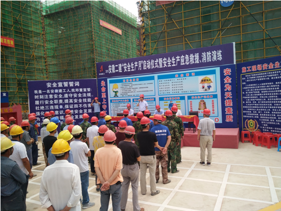 6月16日上午,安全管理部組織、信訪保衛(wèi)部及后勤綜合服務(wù)部協(xié)同在五分公司固鎮(zhèn)名邦國際花都項目開展6.16安全咨詢?nèi)铡踩摹⒑灻?yīng)急救援演練、職工體檢、安全主題宣講、安全生產(chǎn)經(jīng)驗交流、安全教育場館體驗、安全宣傳圖牌展覽等一系列“安全生產(chǎn)月”宣傳教育活動,分管安全副總經(jīng)理葉和永任總指揮,項目部全體管理人員及工人共一百余人參加。