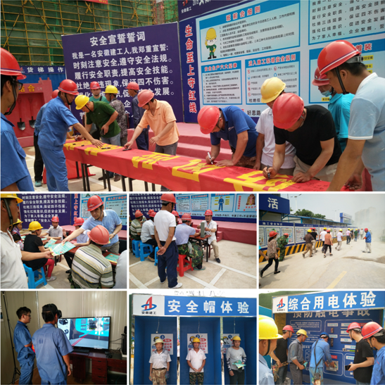活動當(dāng)天,共發(fā)放安全宣傳資料100余份,接受項目職工咨詢50余人次;開展預(yù)防高墜、中暑及火災(zāi)救援演練;給工友們體檢,告知夏季高溫季節(jié)施工注意事項;帶工友們觀看圖片展覽,講解安全生產(chǎn)知識,到安全教育體驗館進行實體和VR虛擬體驗;現(xiàn)場全體人員參與宣誓及簽名活動。現(xiàn)場活動結(jié)束后,安全管理部在會議室開展安全主題宣講活動,帶領(lǐng)項目職工學(xué)習(xí)《安全生產(chǎn)條例》及《建筑安全生產(chǎn)標(biāo)準(zhǔn)化示范工地評價標(biāo)準(zhǔn)》(DB34/T5040-2016),組織項目管理人員開展安全生產(chǎn)經(jīng)驗交流會,總結(jié)工作亮點,查找不足,促進今后工作的順利開展。